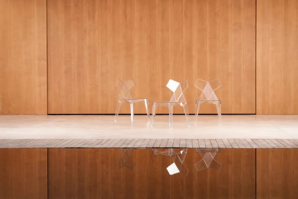 Inspirada en las formas de la indumentaria japonesa, la silla Kimono sigue la línea de investigación de formas facetadas combinada con el juego de transparencias que permite el policarbonato, dando como resultado una pieza elegante y funcional. Su geometría genera una serie de reflejos y transparencias que recuerdan a las formaciones minerales. Un diseño con carácter que, por su materialidad, enlaza en multitud de espacios tanto contemporáneos como clásicos debido al contraste conceptual. La silla Kimono ofrece ligereza visual y un diseño elegante pero no descuida su ergonomía y funcionalidad.