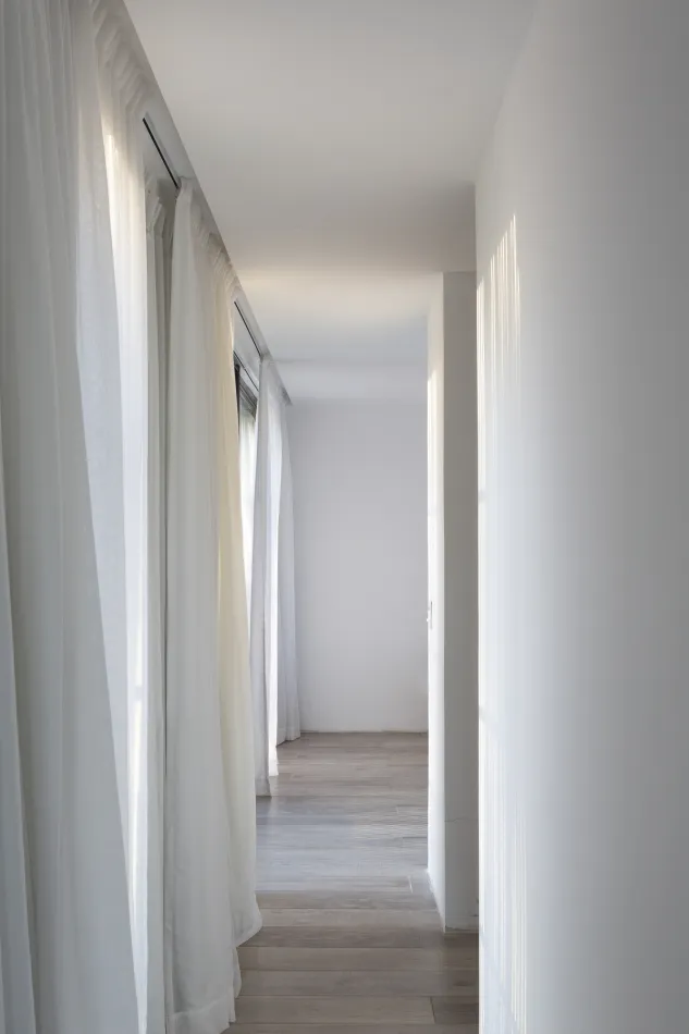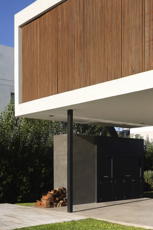 En el caso de esta casa desarrollada en dos plantas hay una idea de toma de partido relacionado al sol de la tarde, que da en el frente del terreno. Sabiendo que cualquier planta alta al frente del mismo generaría sombra, en este caso se decidió desplazar el bloque de la planta superior hacia casi el fondo del lote, logrando de esta manera dejar libre el ingreso del sol de la tarde.