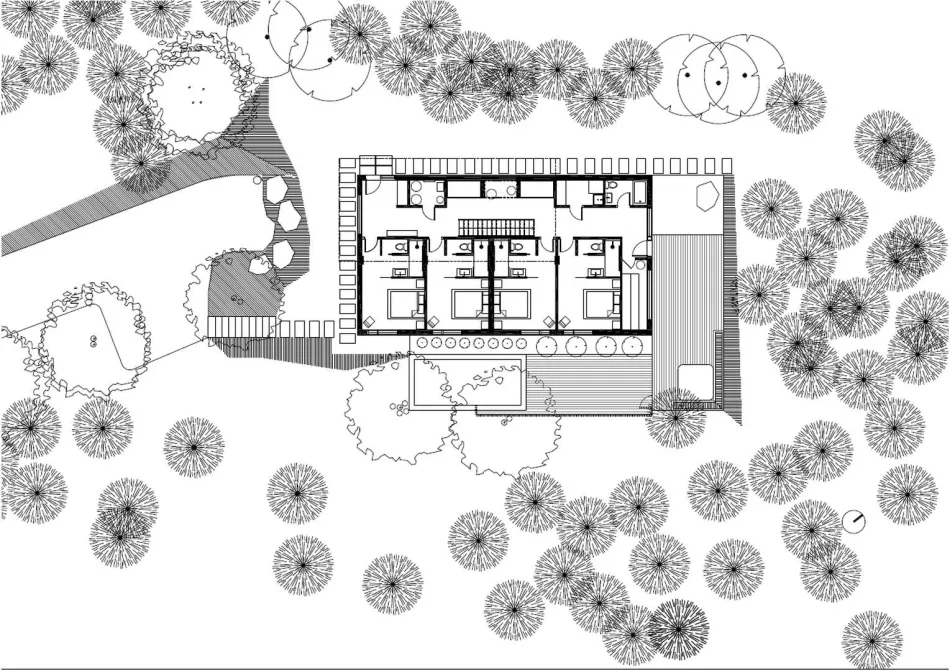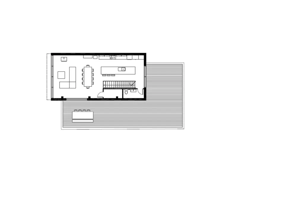 La forma general de la planta de la casa sigue la del terreno, todo en longitud, y está dispuesta en un eje preciso, elegido para ofrecer una vista del río al frente y una gran intimidad gracias al bosque al fondo. Alrededor de este eje se colocan de manera óptima los volúmenes, las aberturas y las estancias interiores. Su distribución minimiza el consumo energético tanto en verano como en invierno, creando un capullo que maximiza la intimidad de sus ocupantes al tiempo que ofrece a las habitaciones la suave luminosidad de un claro de bosque.