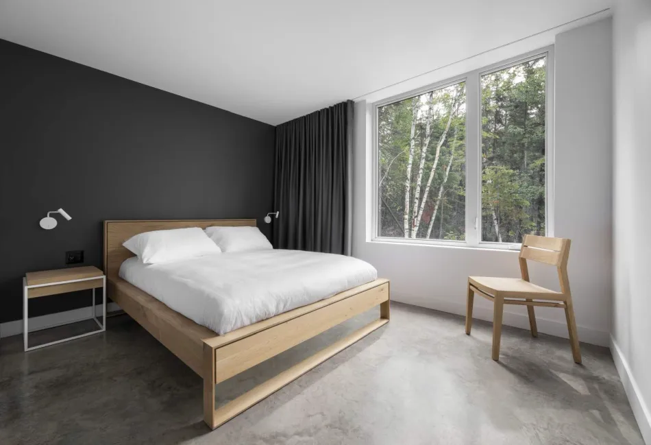 Una paleta de colores neutros (limitada a negro, blanco y madera), una estructura de madera, con acabados en materiales nobles, el uso de volúmenes descentrados y la forma determinante de la función, son marcas registradas de Architecture49. El deseo del diseñador y los propietarios era crear una casa de la que emanara una sensación de comodidad, paz y tranquilidad para que las personas puedan sentir que los espacios contribuyen a su bienestar. El edificio, que es minimalista y fácil de entender y vivir, deja mucho espacio para que los usuarios se expresen. Por lo tanto, pueden apropiarse mejor del espacio mientras se conectan con su entorno. Esta casa está construida para Charlevoix en lugar de una casa construida en Charlevoix.