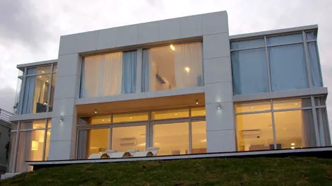 **esta vivienda adopta el lenguaje de la arquitecturacontempor anea concubiertas planas, parametros lisos y grandes superficies vidriadas quepermiten contemplar sin impedimentos un paisaje unico.
