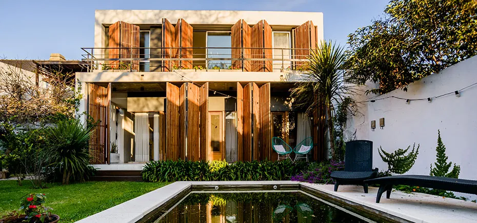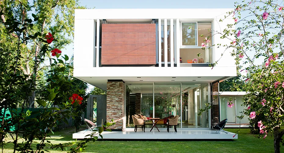 **una casa del estudio alessio – stoichevich que se distingue por sumaterialidad dada por cajas independientes y sus parasoles de maderamóviles.